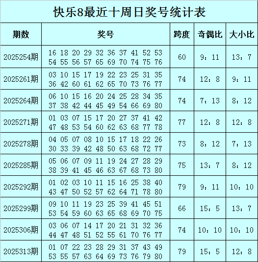 福彩幽静8第2025313期(上周日)开奖追想:01 07 22 23 28 29 31 37 43 49 53 55 57 63 64 69 73 76 79 80,其中奖号奇偶比为15:5,大小比为12:8,012路比为3:13:4,首尾间距为79。