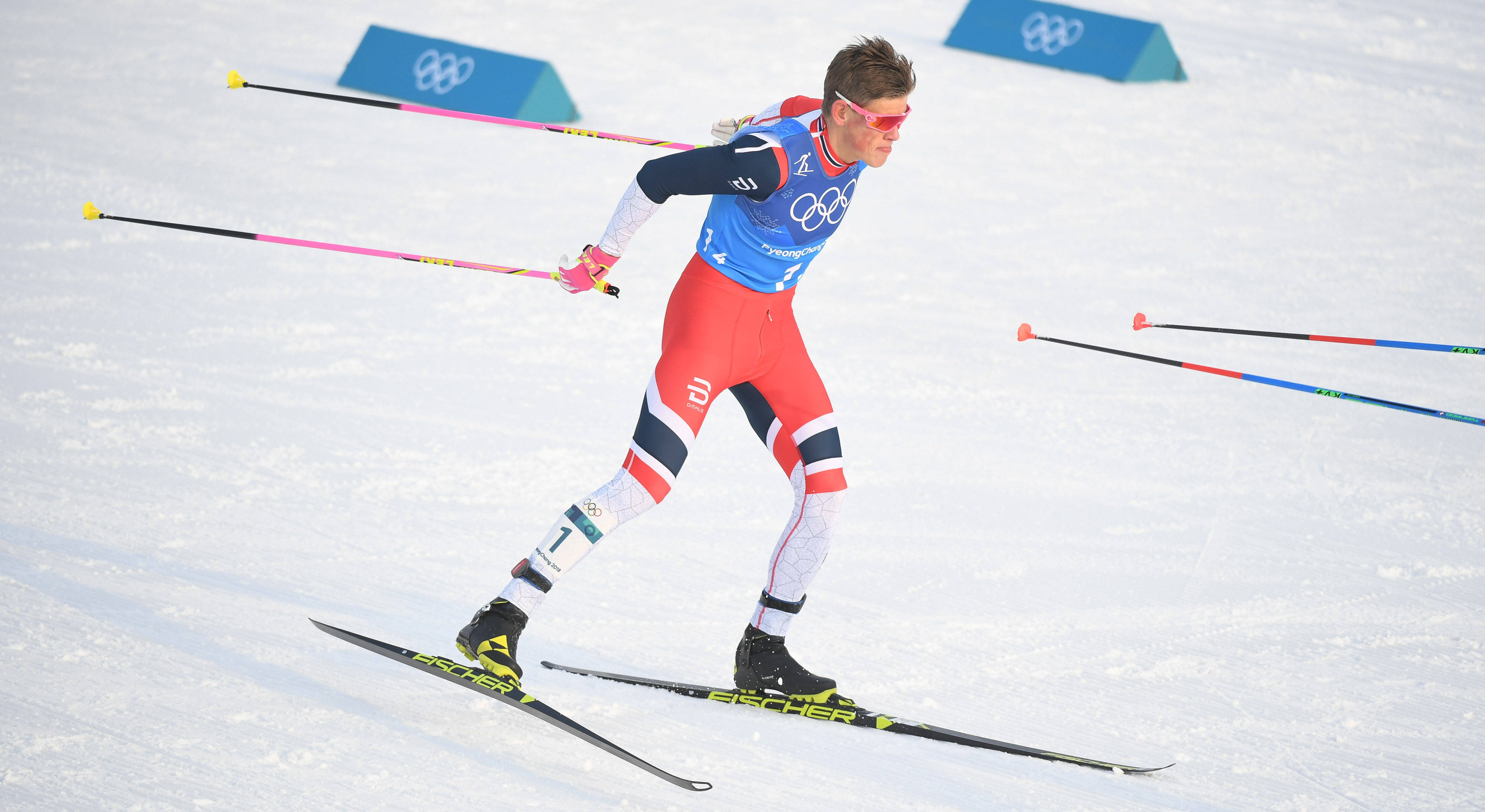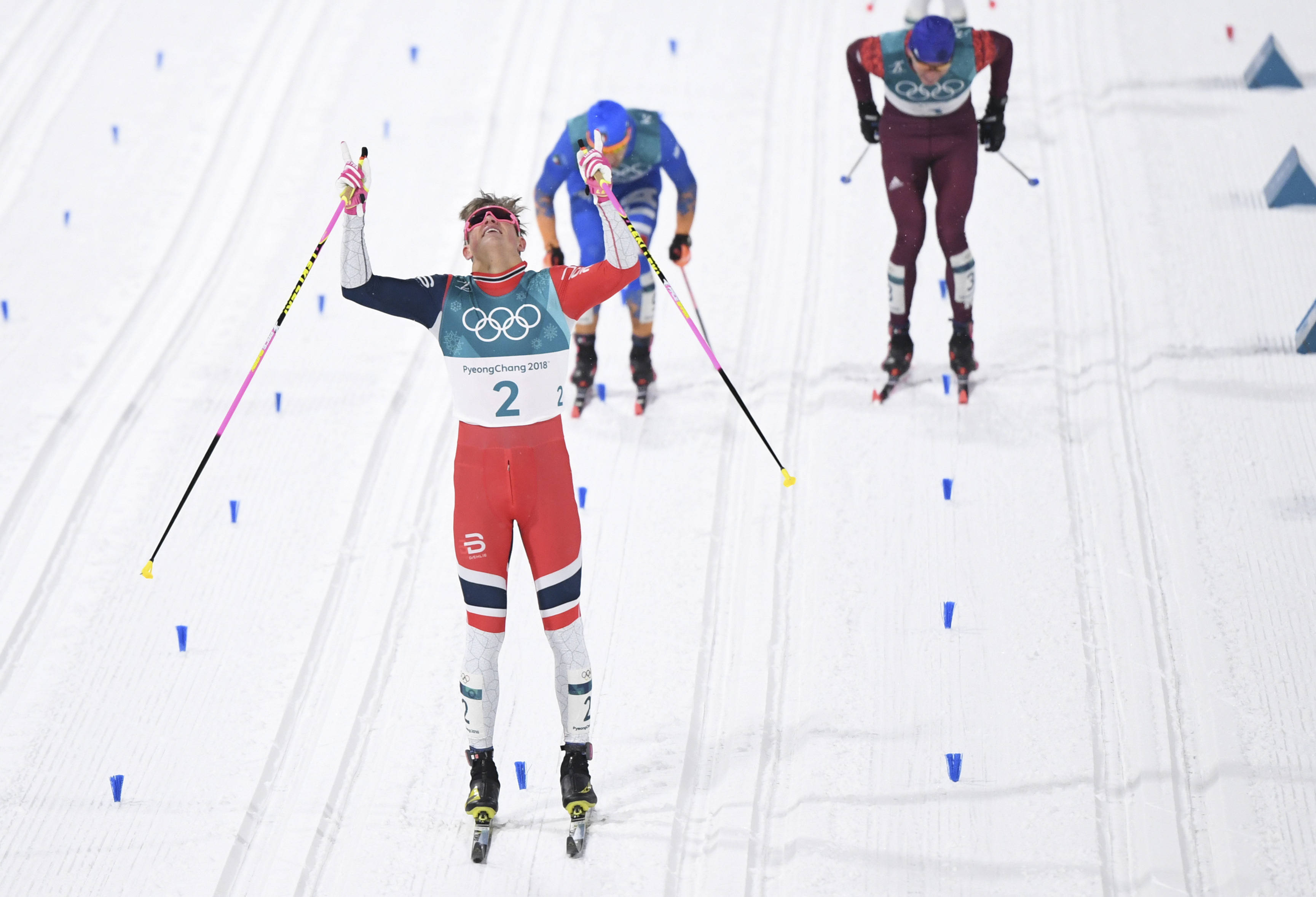 2018年2月18日,挪威队选手克莱博在平昌冬奥会越野滑雪男人4X10公里奋力比赛中。挪威队夺得冠军。新华社记者 王昊飞 摄