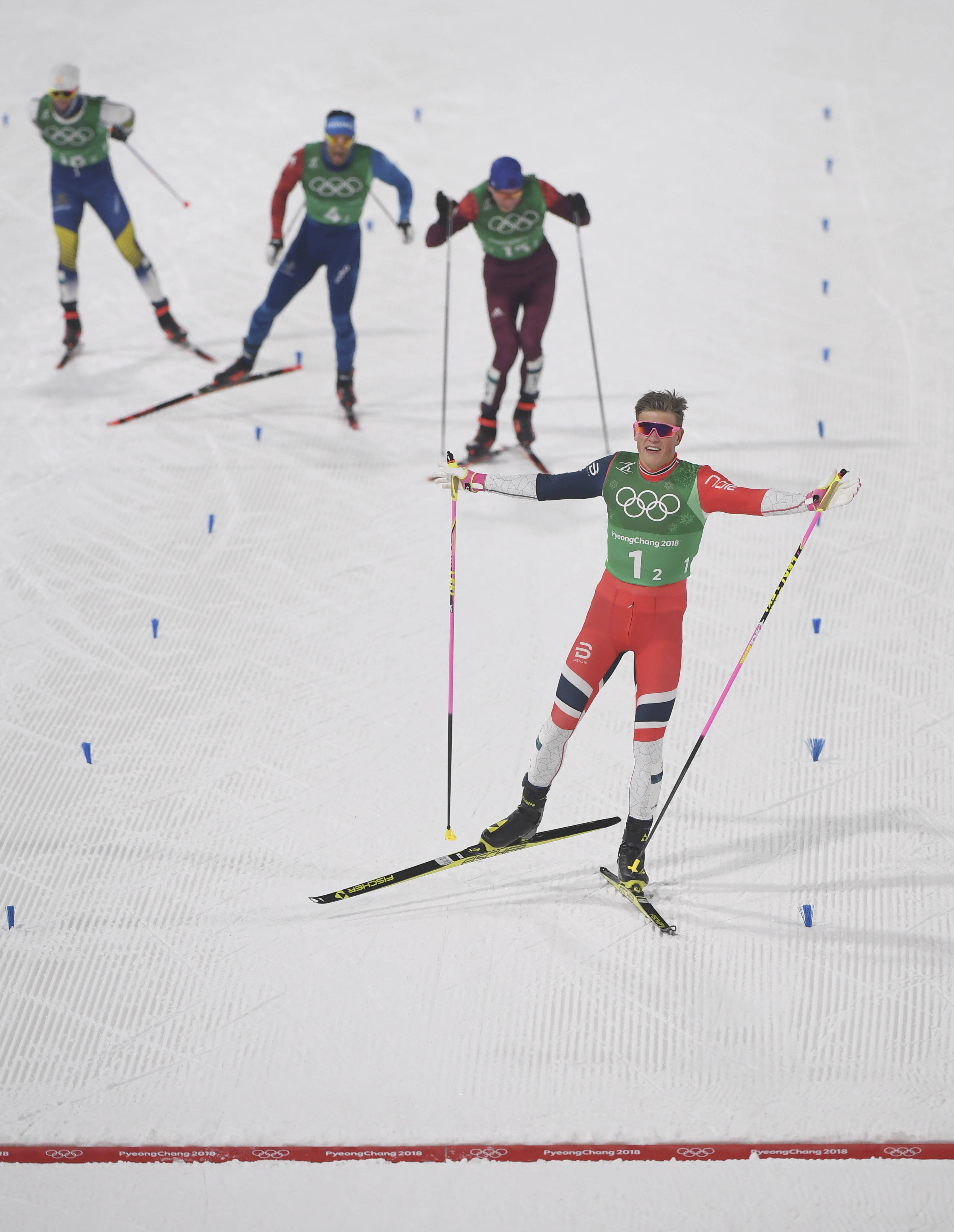 2018年2月21日,挪威队选手克莱博在平昌冬奥会越野滑雪男人团体短距离(目田技能)决赛中冲向荒谬。挪威队夺得冠军。新华社记者 吕小炜 摄