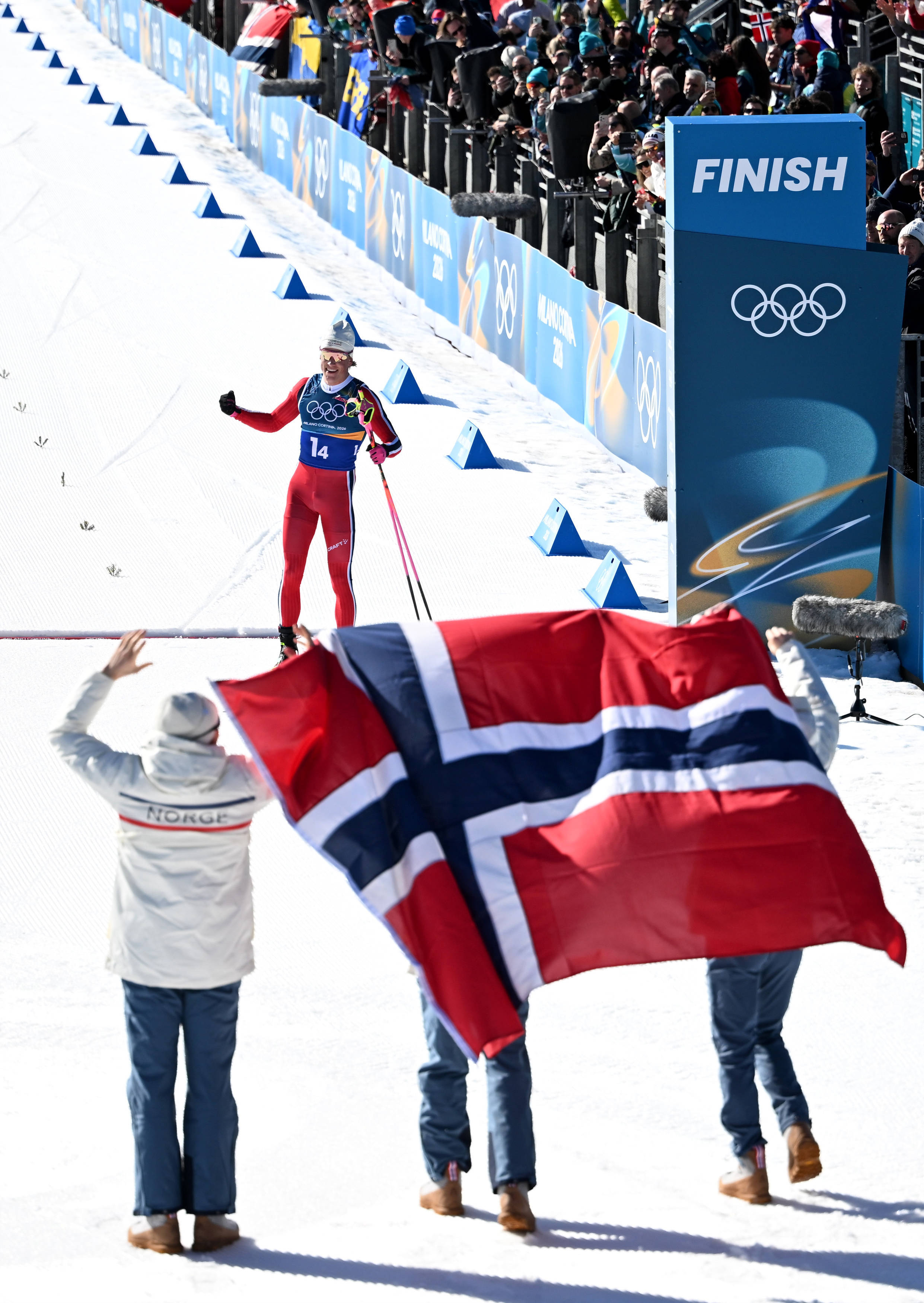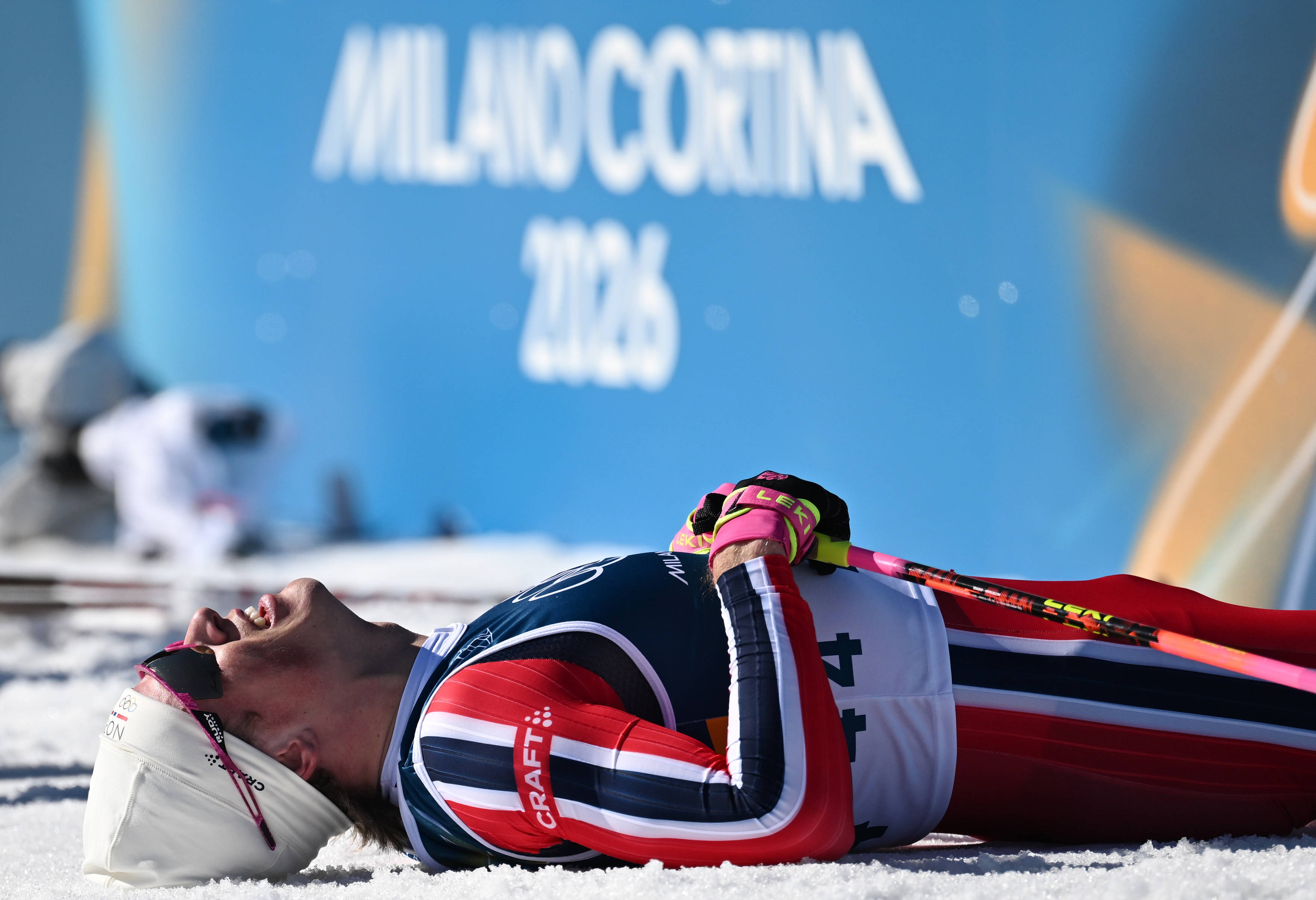 2月15日,挪威队选手克莱博在米兰-科尔蒂纳冬奥会越野滑雪男人4X7.5公里奋力比赛中冲线后。挪威队夺得冠军。新华社记者 贺灿铃 摄这是29岁的克莱博
